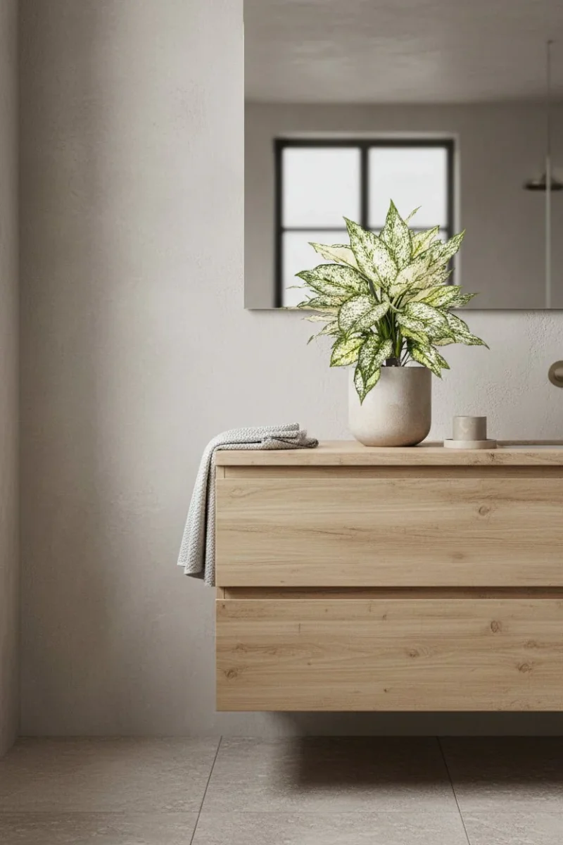 - Trasplante en primavera sin urgencia — al Aglaonema le gusta estar un poco apretado. Trasplante solo cuando las raíces asomen por debajo de la maceta, cada 2–3 años.