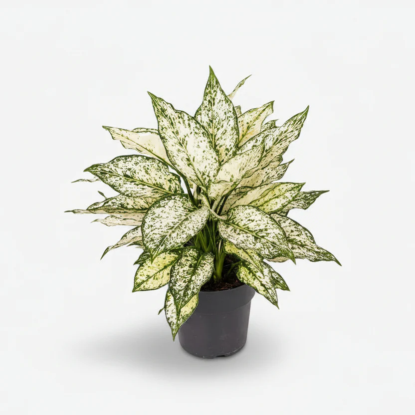 La Aglaonema ‘White Kiwi’ crece naturalmente bajo el dosel tropical — tolera la baja luminosidad mientras conserva su follaje gráfico, una cualidad rara en una planta tan decorativa.