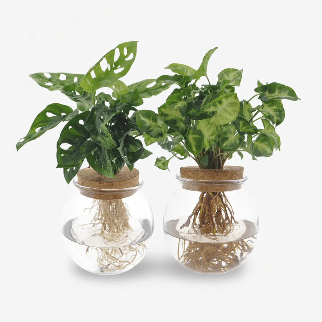 Este dúo reúne dos tropicales colgantes con follajes complementarios en un frasco de vidrio: el Monstera adansonii («Monkey Leaf») con pequeñas hojas perforadas gráficas, y el Syngonium Green («Pata de ganso») con hojas en flecha verde tierno luminoso. Cultivadas en hidroponía, sus raíces están directamente en el agua — visible a través del vidrio transparente.