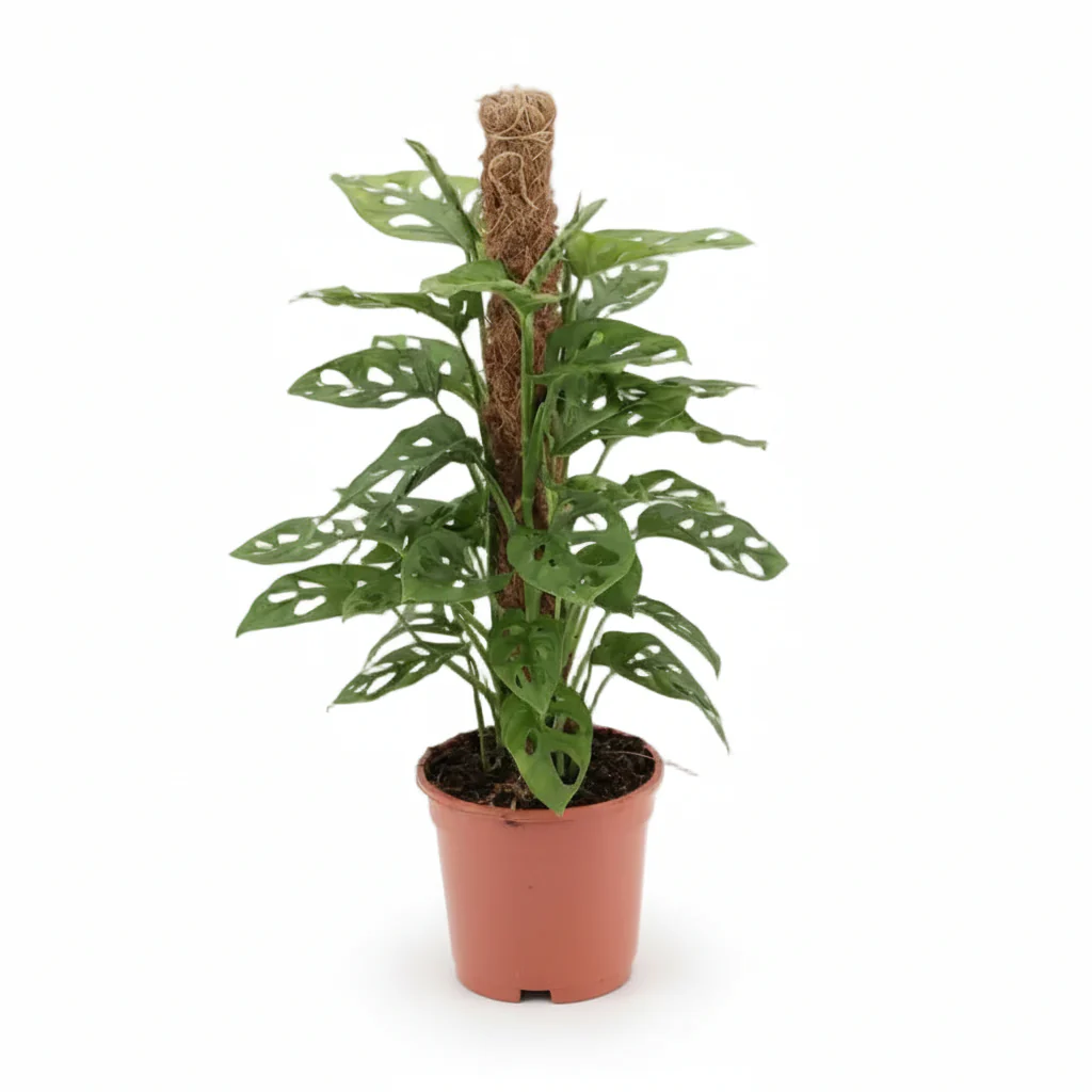 - En tutor en un salón luminoso, plántalo junto a un Philodendron Birkin — las hojas agujereadas del Monstera contrastan con las finas rayas blancas del Birkin para una composición tropical muy gráfica.
